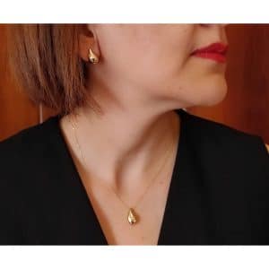 Beautiful set with necklace and pair of earrings with three dimensional drop design in polished 14k yellow gold.