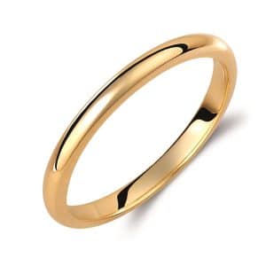 Classic wedding rings, thin with curved top and polished finish. They are made of yellow gold 2mm wide.