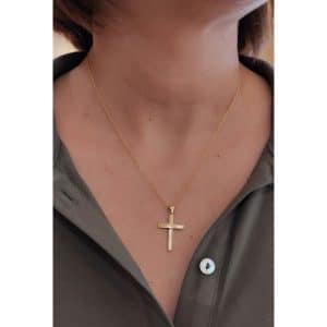 Men’s and baptismal cross made of yellow gold. It has a delicate design with matte steps and a polished last level. It is a set with a chain made mainly…