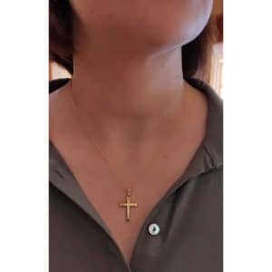 Women’s and baptismal cross made of polished 14k yellow gold. It is narrower and hollow in the center and is decorated on one side with one white natural brilliant-cut diamond….