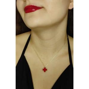 Chain necklace with hanging cross-flower decorated with red stone. It is made of 925° yellow gold plated silver. It also has an extension to adjust its length.