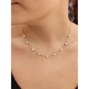 Necklace chain with double-sided crosses-flowers at intervals, decorated with mother of pearl. It is made of 925° white platinum-plated silver. It also has an extension to adjust its length.