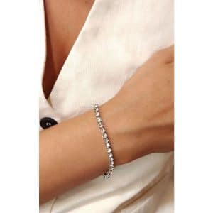 Tennis bracelet made of high quality white stainless steel. It is decorated with a series of shiny white cubic zirconia stones that add elegance and shine. It features a practical…