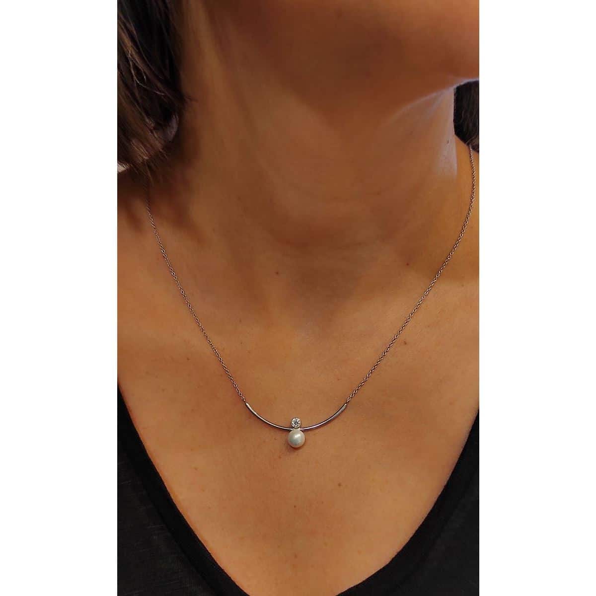 Necklace chain with a curved bar that in the center is decorated above with a single white zircon stone and below with a white natural cultured freshwater pearl, made of white platinum-plated silver 925° and with an additional link in the chain to adjust the length. Pair it with its bracelet for a great set.