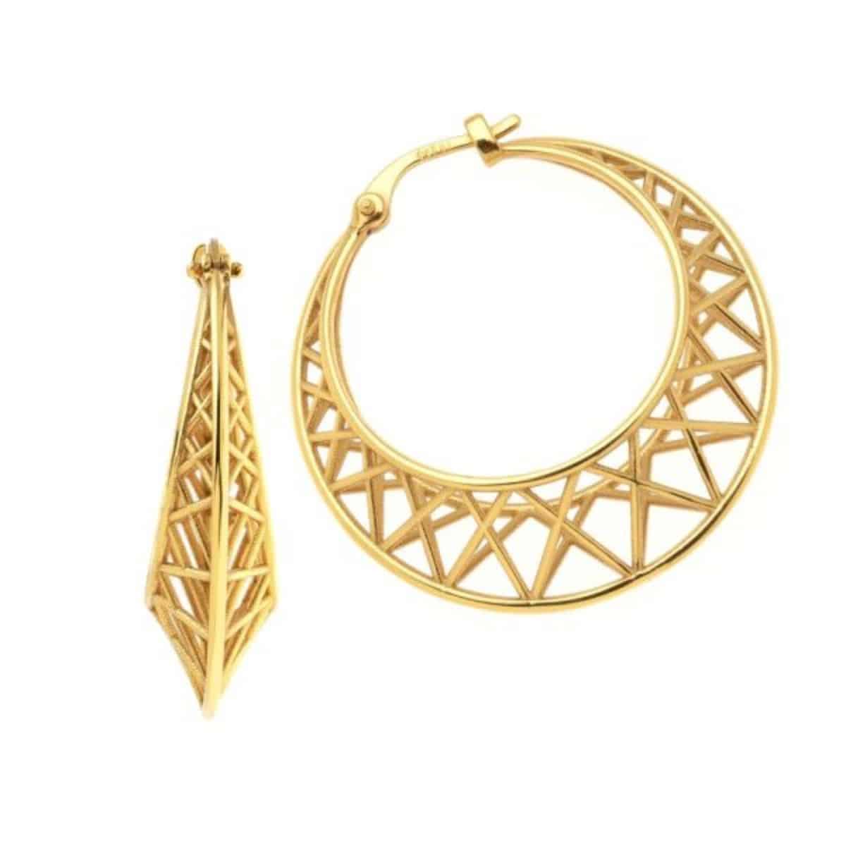 Innovative 925° yellow gold plated sterling silver hoop earrings with mesh border on the bottom with extra resin for color fastness. Make a difference with these hoops.