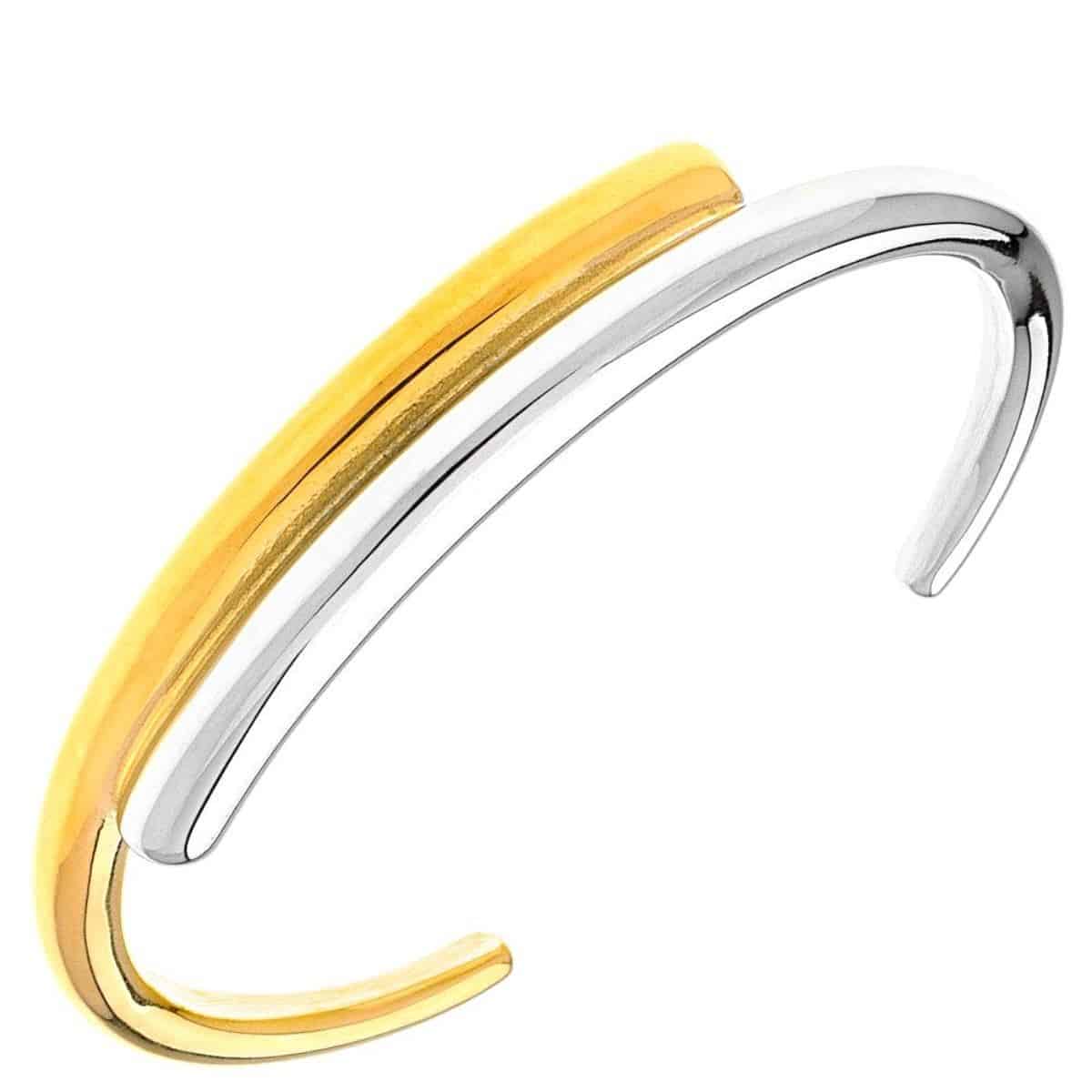A fixed stainless steel cuff bracelet with a striking two-tone contrast. Its modern, clean lines and curved design add elegance and dynamism. The dual tone allows for easy combination with other jewelry and adds character to any look. Ideal for everyday use as well as more formal occasions, it is a must-have piece for lovers of contemporary style.