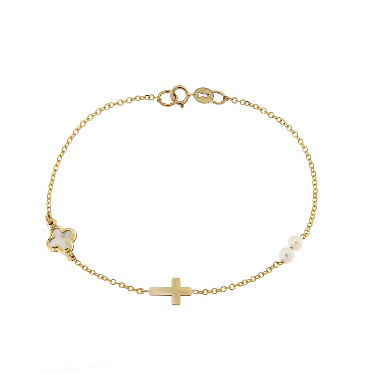 Beautiful bracelet with two white natural cultured pearls, one polished cross and mother of pearl in a flower frame integrated in a chain, made of 9 karats yellow gold.