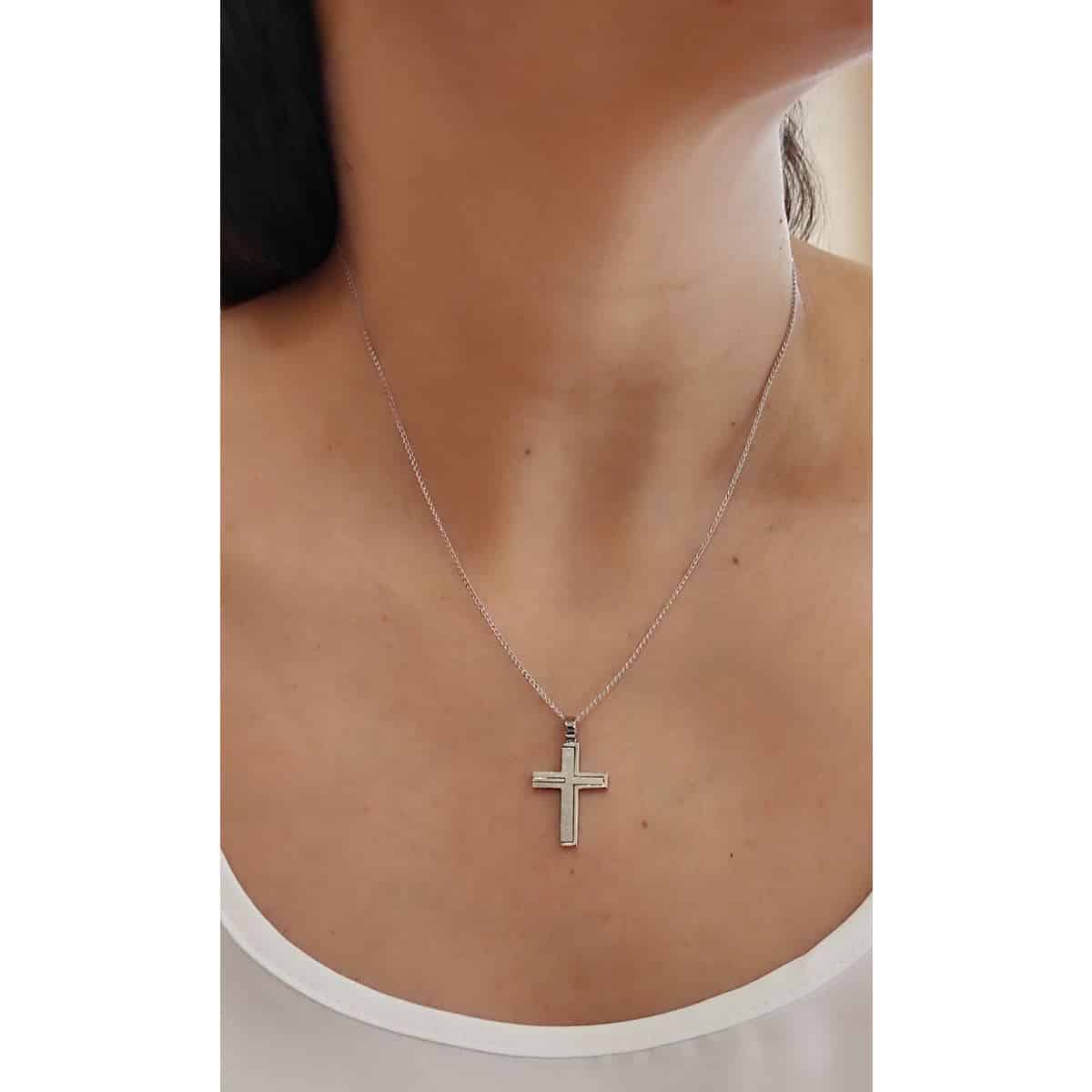 Cross made of 18 karat white gold, with ice matte and polished parts that create a design, for man, woman and baptism.
