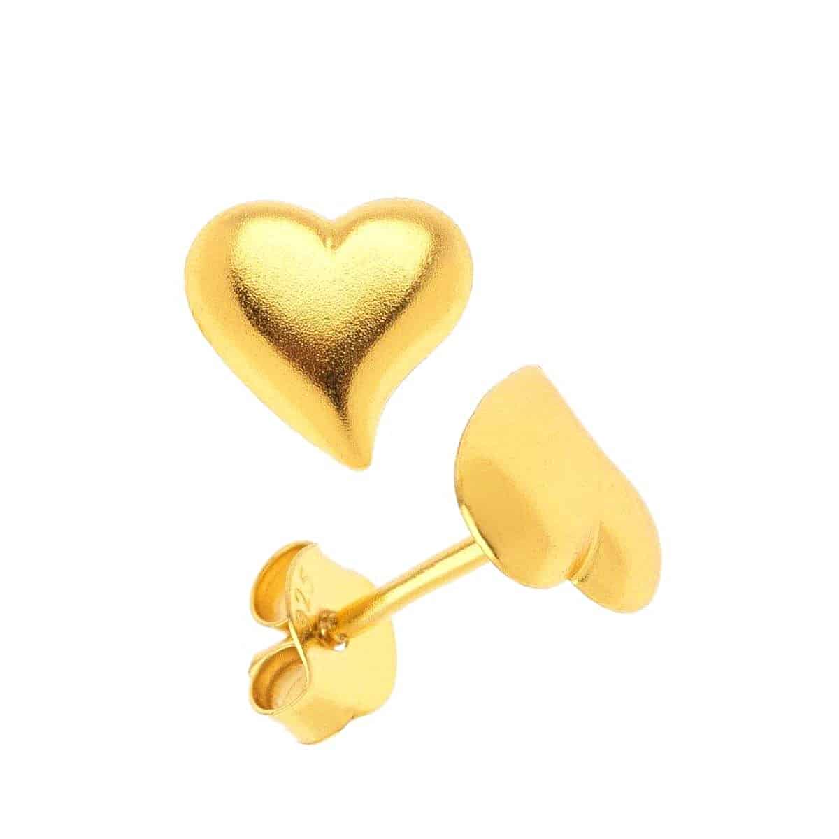 Pair of heart-shaped stud earrings with a light matte texture made of yellow gold-plated 925° silver with additional resin for great color durability.