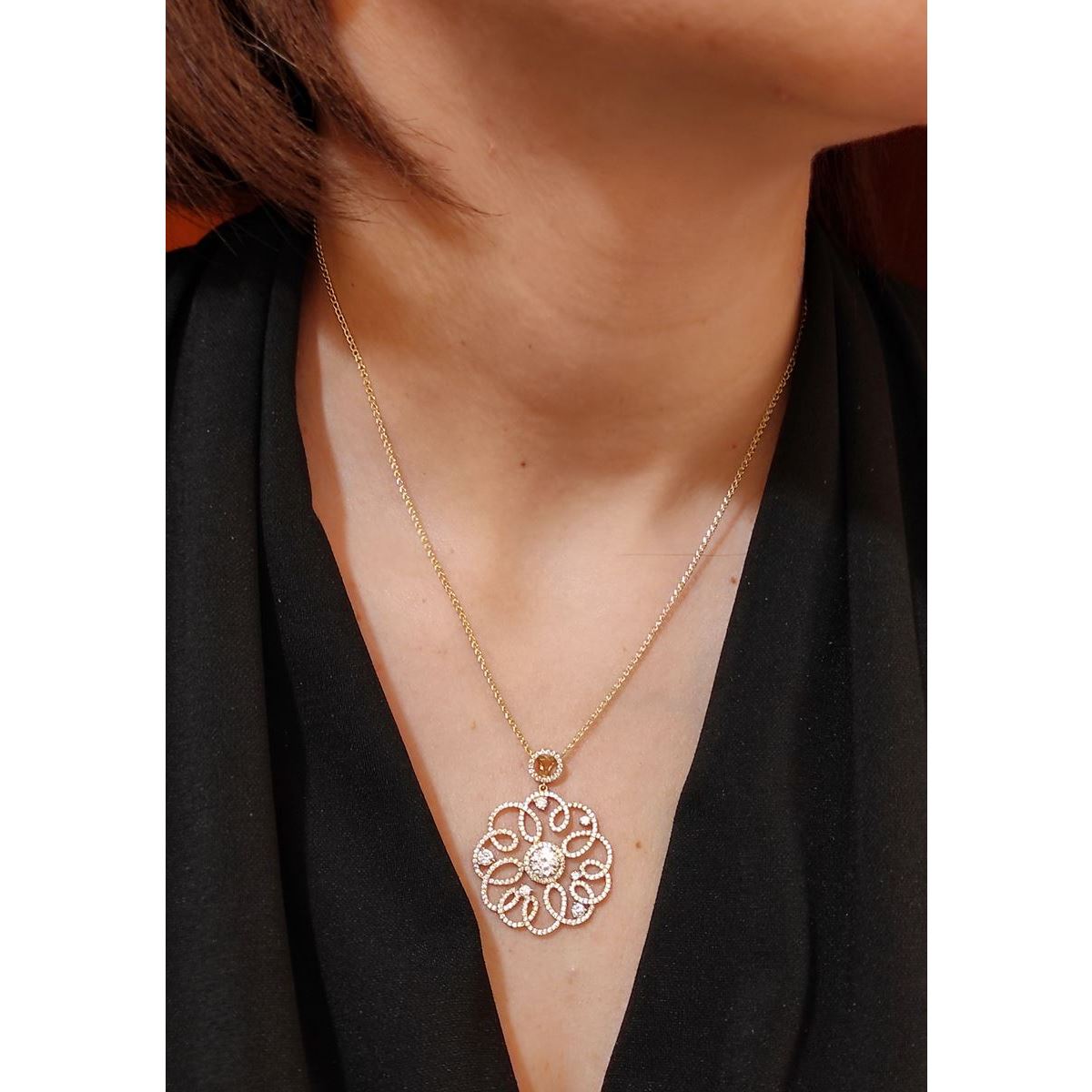 Large flower rosette pendant all decorated with white cubic zirconia stones, in 14 karat yellow gold. Combine it with a gold chain from our collection and impress with a formal outfit.
