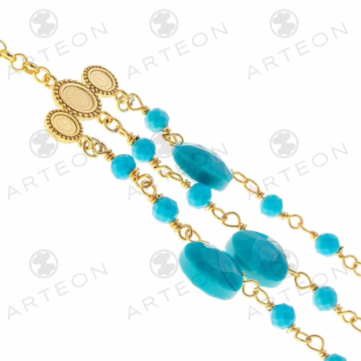 Handmade necklace with three rows of woven mineral blue round and teardrop stones. At the end is a chain with links for adjusting the length. It is made of yellow gold-plated 925° silver with resin for great color resistance.
