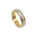 Two-tone gold wedding rings, 4mm wide. They feature a white embossed rhombus pattern interior and polished yellow gold exteriors.