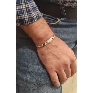 Βραχιόλι κλασική ταυτότητα μασίφ κατασκευής από από λευκό επιπλατινωμένο ασήμι 925° δεμένη σε πλατιά αλυσίδα με μήκος για τον άνδρα. Λόγω του σχεδίου της αλυσίδας μπορείτε να κουμπώνετε το κλιπ…