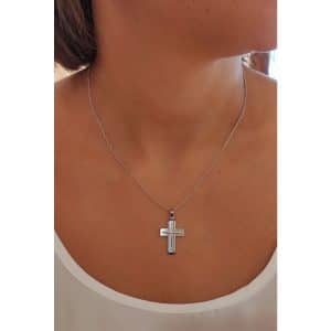 Σταυρός από λευκό χρυσό 14 καρατίων. Δεν έχει κρίκο για κρέμασμα, η αλυσίδα περνάει κρυφά μέσα από αυτόν. Φοριέται κι από τις δύο όψεις. Από τη μία όψη έχει ματ…