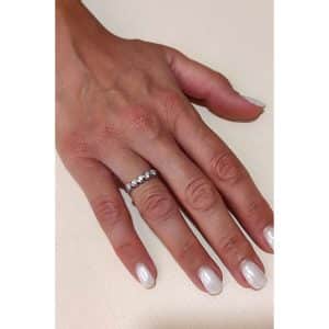 Δαχτυλίδι με εννιά ίδιου μεγέθους εν σειρά λευκές πέτρες ζιργκόν που ταιριάζει με τη βέρα και το μονόπετρο, από λευκό χρυσό 14 καρατίων.