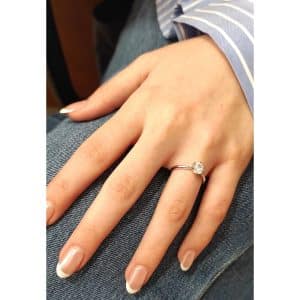 €1.845,00Μονόπετρο δαχτυλίδι από λευκό χρυσό 18 καρατίων με φυσικό διαμάντι κοπής emerald και πλαϊνά διαμάντια brilliant.Πιστοποίηση από G.I.A. – ιδανικό για πρόταση γάμου.