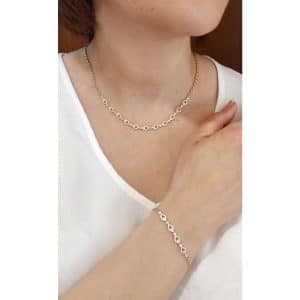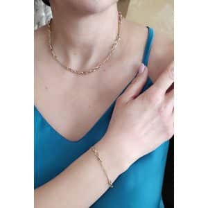 Σετ από κίτρινο χρυσό 14 καρατίων, κολιέ και βραχιόλι με σχέδιο οβάλ κρίκων που εναλλάσσεται με διπλή αλυσίδα και με επιπλέον προεκτάσεις για αυξομείωση του μήκους. Πολύ όμορφη επιλογή!