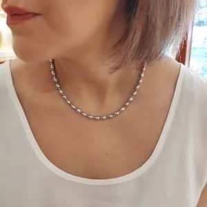 Σετ μαργαριτάρια Fresh Water Pearl 5×7mm Κ14 που περιλαμβάνει κολιέ και βραχιόλι με γκρι μαργαριτάρια ποιότητας ΑΑΑΑ, αιματίτες λευκού χρώματος και κούμπωμα από λευκό χρυσό 14 καρατίων.