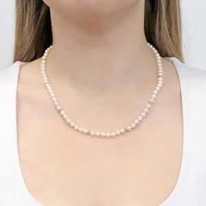 Σετ αποτελούμενο από κολιέ και βραχιόλι με λευκά μαργαριτάρια γλυκού νερού Fresh Water Pearl διαμέτρου 5 – 5,5 χιλιοστών σε σχήμα Round (στρογγυλό) ποιότητας AΑΑΑ. Ανάμεσα στα μαργαριτάρια υπάρχουν κίτρινες…