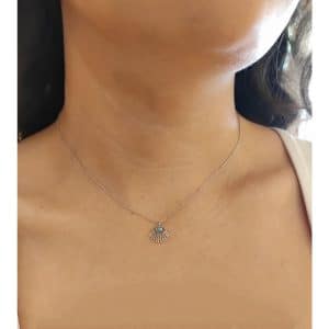 Κολιέ αλυσίδα με ενσωματωμένο μάτι και σταυρουδάκι στο πλάι διακοσμημένα με λευκές ζιργκόν πέτρες και μπλε σμάλτο. Είναι κατασκευασμένο από λευκό επιπλατινωμένο ασήμι 925°. Επίσης πριν το τελείωμα τοποθετείται επιπλέον…