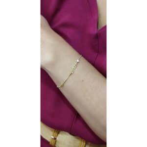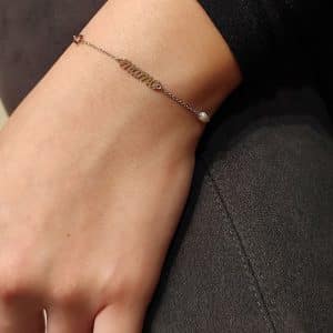 Όμορφο βραχιόλι με αλυσίδα κι ενσωματωμένα στοιχεία από λευκό χρυσό 9 καρατίων. Στο κέντρο υπάρχει το mama κι από τη μία του πλευρά είναι πλεγμένα δύο λευκά μαργαριτάρια γλυκού νερού,…