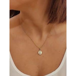 Όμορφο στρογγυλό κρεμαστό φυλαχτό, από κίτρινο χρυσό 9 καρατίων. Έχει δύο όψεις, από τη μία μέσα σε λουστρέ ανάγλυφο περίγραμμα είναι η Παναγία σε λευκό ματ με κίτρινο φόντο κι…