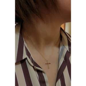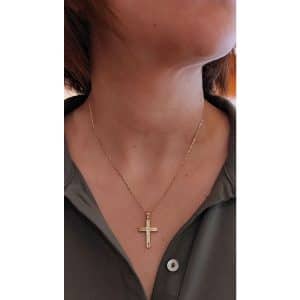 Κολιέ σταυρός βαριάς κατασκευής με αλυσίδα από κίτρινο χρυσό 14 καρατίων, κυρτός και στολισμένος με λευκές πέτρες ζιργκόν σε μερικά μέρη. Σικ επιλογή για όλες τις ώρες της ημέρας, αλλά…