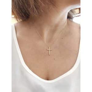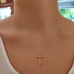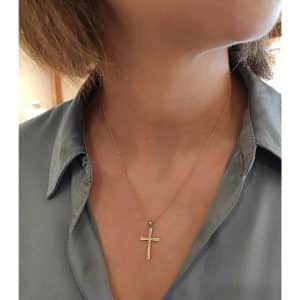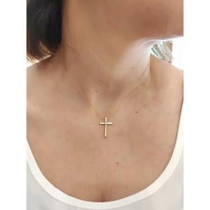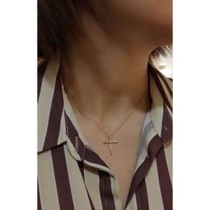 Κολιέ γυναικείος λιτός σταυρός με αλυσίδα από λείο κίτρινο χρυσό 14 καρατίων. Στενός με μεγάλο ύψος προφίλ και ευθείες γραμμές. Σικ επιλογή για όλες τις ώρες της ημέρας και για…