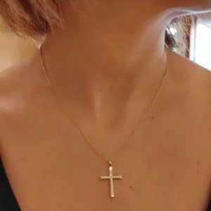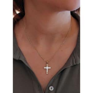 Βαπτιστικός σταυρός από κίτρινο χρυσό, με την αλυσίδα του από κατά βάση κίτρινο με μια πινελιά λευκό χρυσό για κορίτσια. Ο σταυρός έχει κρυφό κρέμασμα και στενεύει προς το κέντρο….