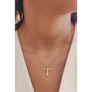 Βαπτιστικός σταυρός από κίτρινο χρυσό, με την αλυσίδα του από κατά βάση κίτρινο με μια πινελιά λευκό χρυσό για κορίτσια. Στενός με ύψος και στολισμένος με λευκές ζιργκόν πέτρες. Από…