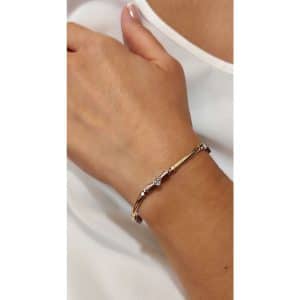 Περίτεχνο αρθρωτό βραχιόλι με μακρόστενα στοιχεία από κίτρινο χρυσό ματ και λουστρέ φινιρίσματος εναλλάξ με στοιχεία από λείο λευκό χρυσό στρογγυλά χωρίς πέτρες και στολισμένα με λευκές πέτρες ζιργκόν μακρόστενα….