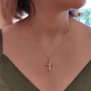 Μασίφ γυναικείος σταυρός για βάπτιση ή αρραβώνα από κίτρινο χρυσό 14 καρατίων, λουστρέ φινίρισμα και λευκές πέτρες ζιργκόν κατά μήκος του και λεπτομέρειες από λευκό χρυσό στα άκρα του. Ένα…