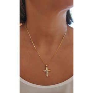 Ανδρικός και βαπτιστικός σταυρός διπλής όψης από δίχρωμο χρυσό 14 καρατίων. Το κυρίως σώμα του είναι από λείο κίτρινο χρυσό και από την μία πλευρά του έχει ένα λείο έλασμα…