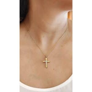 €405,00Γυναικείος και βαπτιστικός σταυρός από κίτρινο και λευκό χρυσό 14 καρατίων με λουστρέ φινίρισμα λεπτή γραμμή πιο στενός στο κέντρο και με ύψος διακοσμημένος με λευκές πέτρες ζιργκόν.