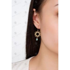 Ζευγάρι σκουλαρίκια κρεμαστά με σχέδιο λουστρέ ήλιο και από κάτω να κρέμεται γαλάζιος aqua κρύσταλλος σε πλαίσιο, από ασήμι 925° με κίτρινη επιμετάλλωση και επιπλέον ρητίνη για αντοχή στο χρώμα.