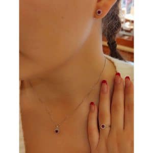 Ζευγάρι σκουλαρίκια στρογγυλές ροζέτες με κόκκινη κεντρική στρογγυλή πέτρα ζιργκόν και μικρότερες λευκές περιμετρικά με όμορφο κάρφωμα. Είναι κατασκευασμένες από λευκό χρυσό 14 καρατίων.