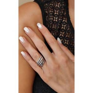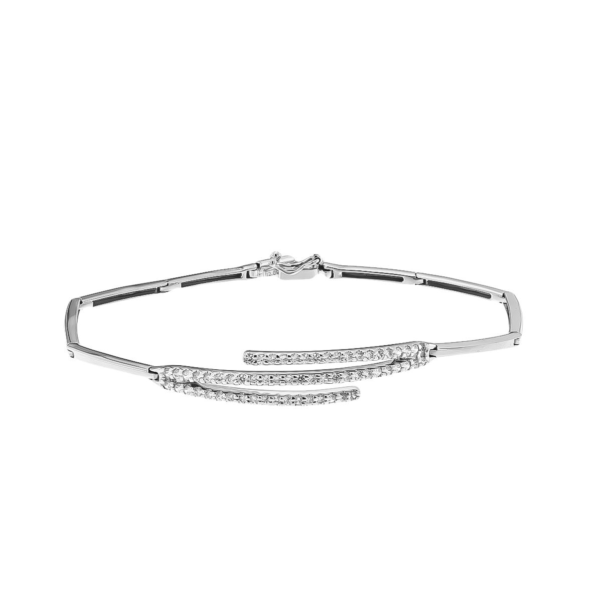 Βραχιόλι αρθρωτό που στο επάνω μέρος έχει μακρόστενο σχέδιο με τρεις βέργες στολισμένες με λευκές ζιργκόν πέτρες, από λευκό χρυσό 14 καρατίων. Συνδυάζεται με το κολιέ και τα σκουλαρίκια της ίδιας σειράς.