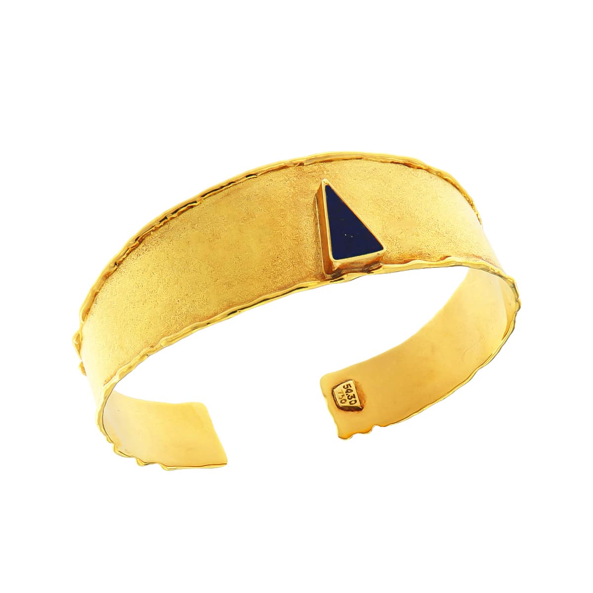 Εντυπωσιακό εξ ολοκλήρου χειροποίητο βραχιόλι με τριγωνική μπλε Λάπις Λάζουλι πέτρα και ανασήκωμα στις άκρες, ανοιχτό από το κάτω μέρος για να περνάει πρώτα από το πλάι του καρπού του χεριού και μετά να γυρίζει. Ένα κόσμημα που θα κλέψει τις ματιές όλων από ματ και λουστρέ φινίρισμα και κίτρινο χρυσό 18 καρατίων.