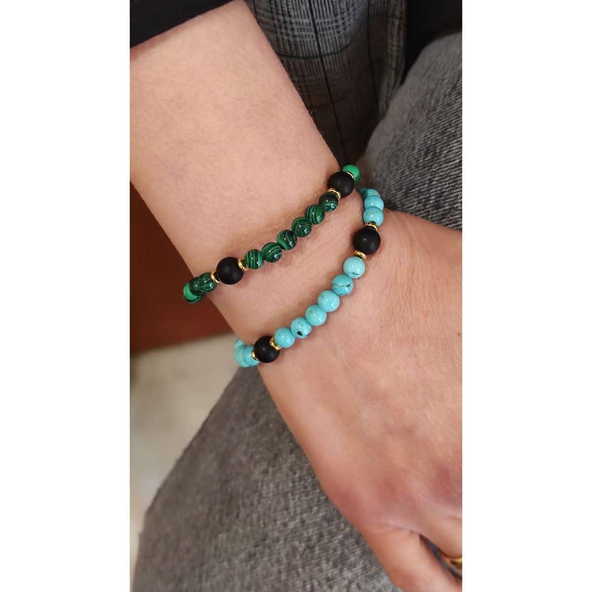 Βραχιόλι με Τιρκουάζ διαμέτρου 6,5 χιλιοστών κι ανά διαστήματα όνυχες διαμέτρου 8,5 χιλιοστών πλαισιωμένους από αιματίτες τεχνητού κίτρινου χρυσού χρωματισμού. Το βραχιόλι είναι ελαστικό και προσαρμόζεται εύκολα σε οποιοδήποτε χέρι.