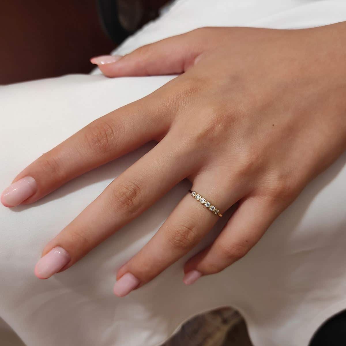 Εξάπετρο λεπτό σειρέ δαχτυλίδι με λευκές πέτρες ζιργκόν ενσωματωμένες σε θήκες, από κίτρινο χρυσό 14 καρατίων.