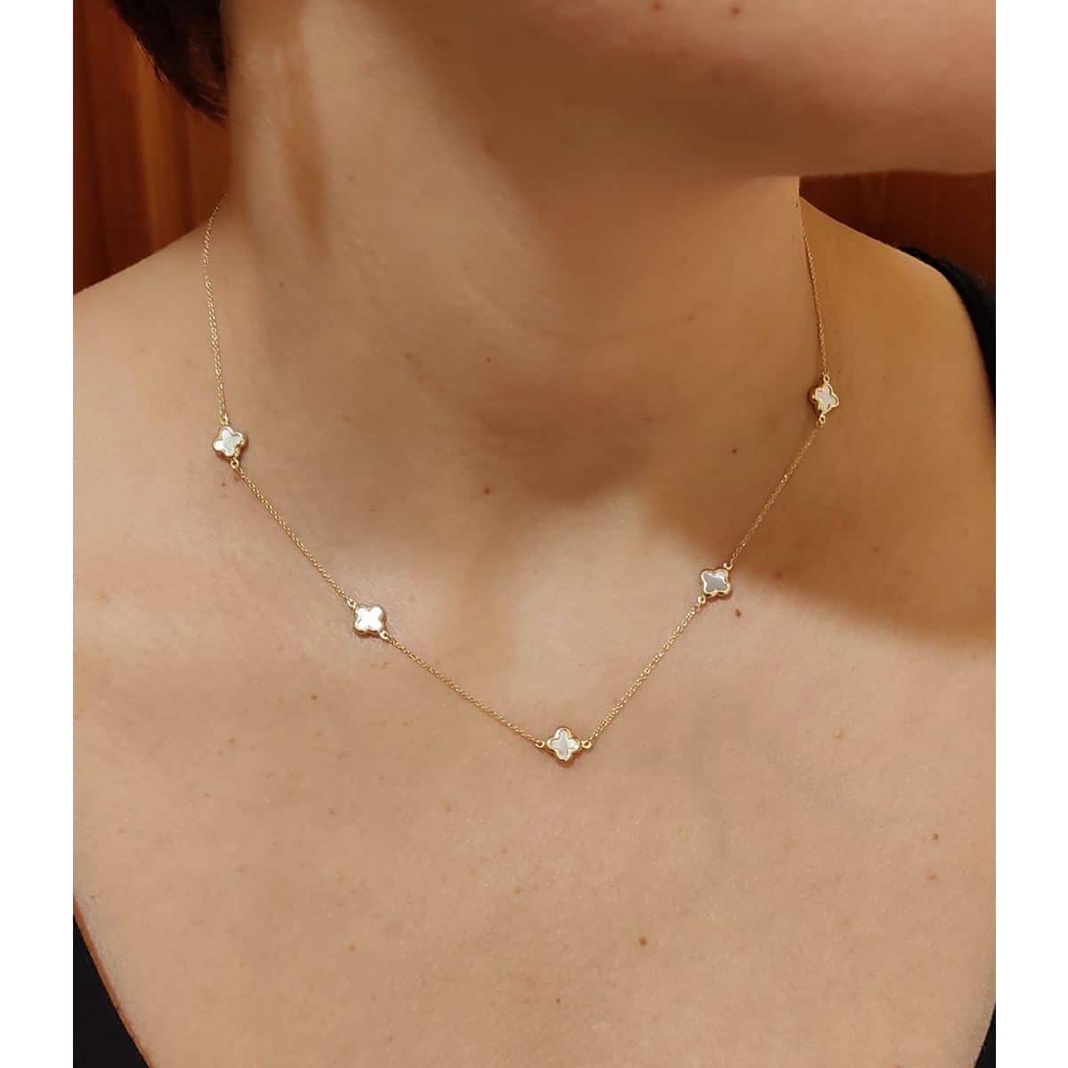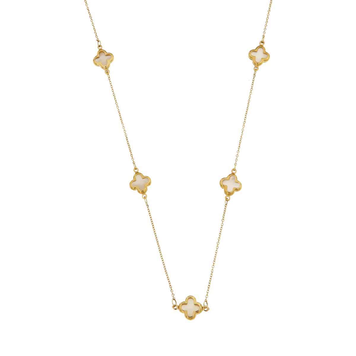 Κολιέ αλυσίδα με ενσωματωμένα ανά διαστήματα πέντε μικρά σταυρουδάκια – λουλουδάκια διπλής όψης από λευκό mother of pearl, πλαισιωμένα με κίτρινο χρυσό και κρικάκια για ευλυγισία και ασφάλεια. Είναι κατασκευασμένο από κίτρινο χρυσό 14 καρατίων και διαθέτει προέκταση για αυξομείωση στο μήκος της αλυσίδας. Συνδυάστε το με το βραχιόλι και τα σκουλαρίκια της ίδιας σειράς για ένα όμορφο σετ.