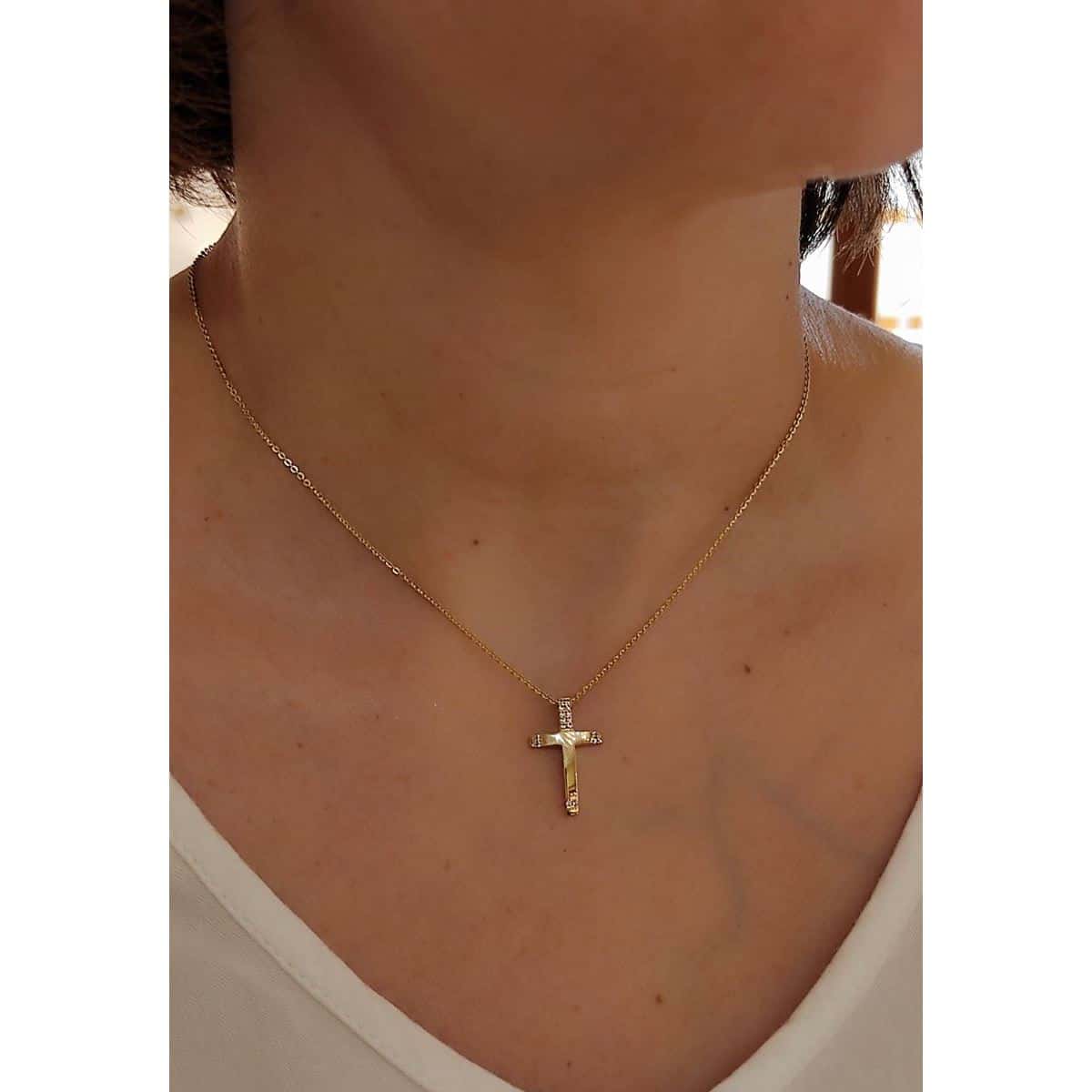 Κολιέ σταυρός βαριάς κατασκευής με αλυσίδα από κίτρινο χρυσό 14 καρατίων, κυρτός και στολισμένος με λευκές πέτρες ζιργκόν σε μερικά μέρη. Σικ επιλογή για όλες τις ώρες της ημέρας, αλλά και για βάπτιση.