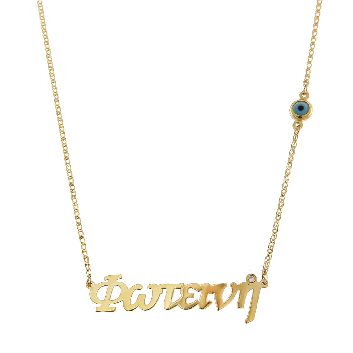 Κολιέ όνομα από λείο κίτρινο χρυσό 14 καρατίων με μία μικρή ζιργκόν πέτρα για τόνο και με δίχρωμη δυνατή αλυσίδα με ματάκι διπλής όψης σε πλαίσιο και με επιπλέον προέκταση για αυξομείωση στο μήκος του κουμπώματος.