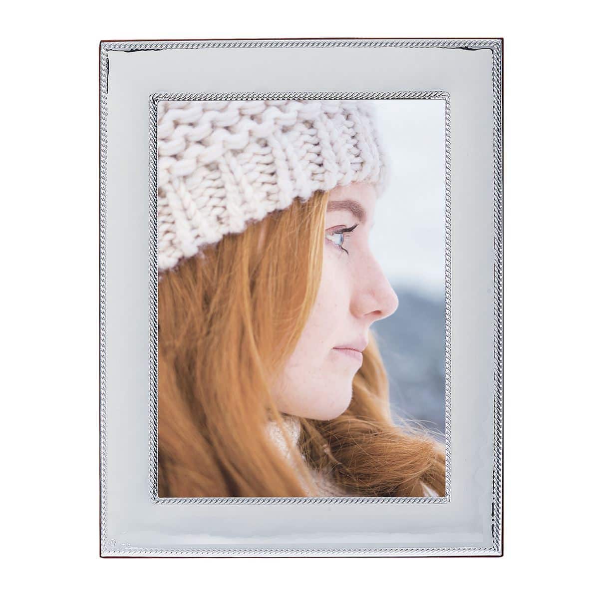 Κορνίζα μεγάλου πλάτους και λείο σχέδιο με σιρίτι στις άκρες, σε φιλμ από ασήμι 950° επάνω σε κράμα μετάλλου, με ειδική επεξεργασία που το κάνει ανεξίτηλο και καφέ ξύλινη πλάτη. Ιδανική για δώρο γάμου και για να διακοσμήσετε το σπίτι με τις πιο όμορφές σας αναμνήσεις.