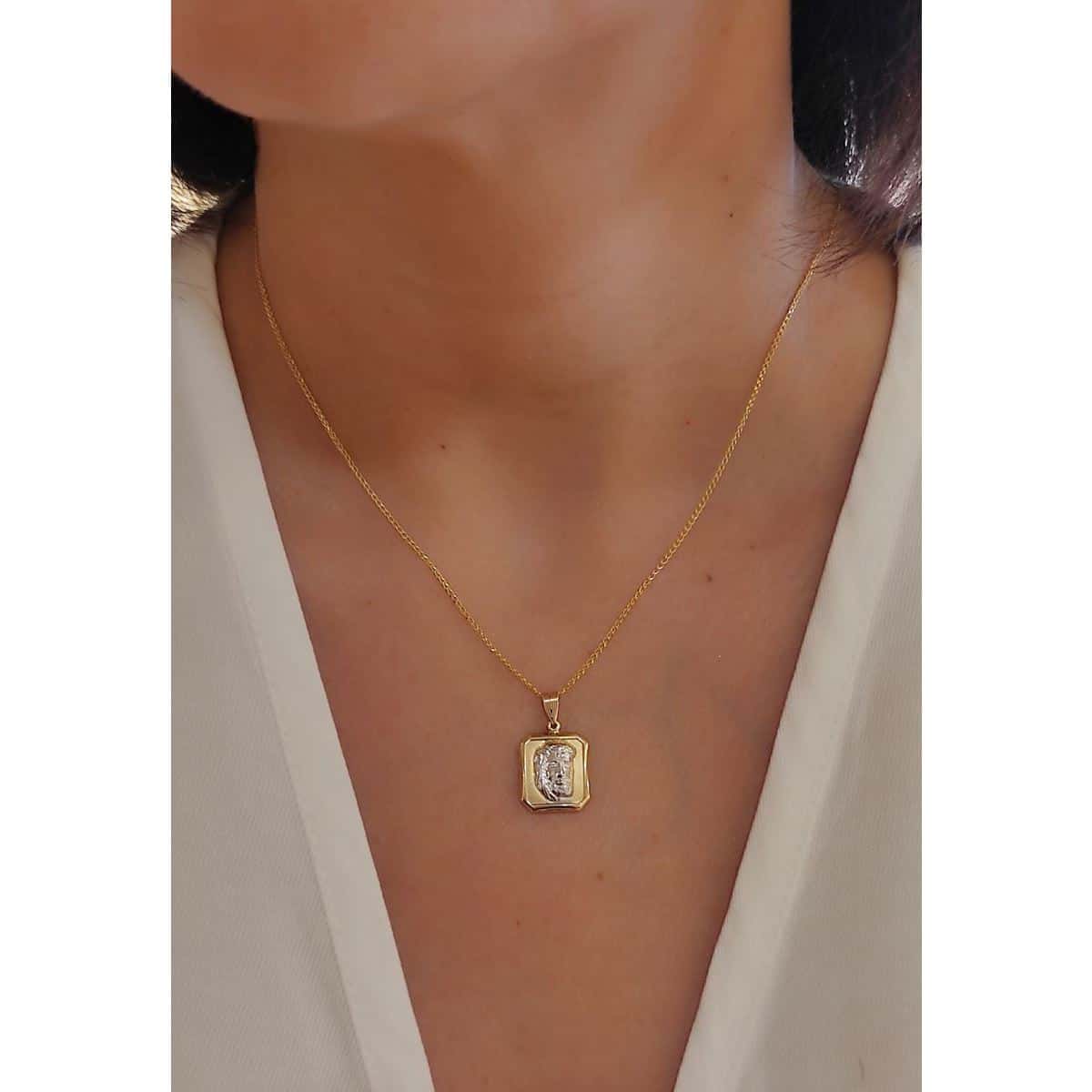 Κρεμαστό διπλής όψης από δίχρωμο χρυσό 9 καρατίων, από τη μία πλευρά γυαλισμένη λευκή Παναγία μέσα σε κίτρινο ματ φόντο με λουστρέ πλαίσιο και από την άλλη Κωνσταντινάτο. Ιδανική επιλογή για το λίκνο ή το καροτσάκι του μωρού σας. Μπορείτε να το συνδυάσετε είτε με χρυσή παραμάνα είτε με αλυσίδα από τη συλλογή μας. Συνοδεύται με μεταλλική παραμάνα του ίδιου χρώματος σε παιδική συσκευασία.