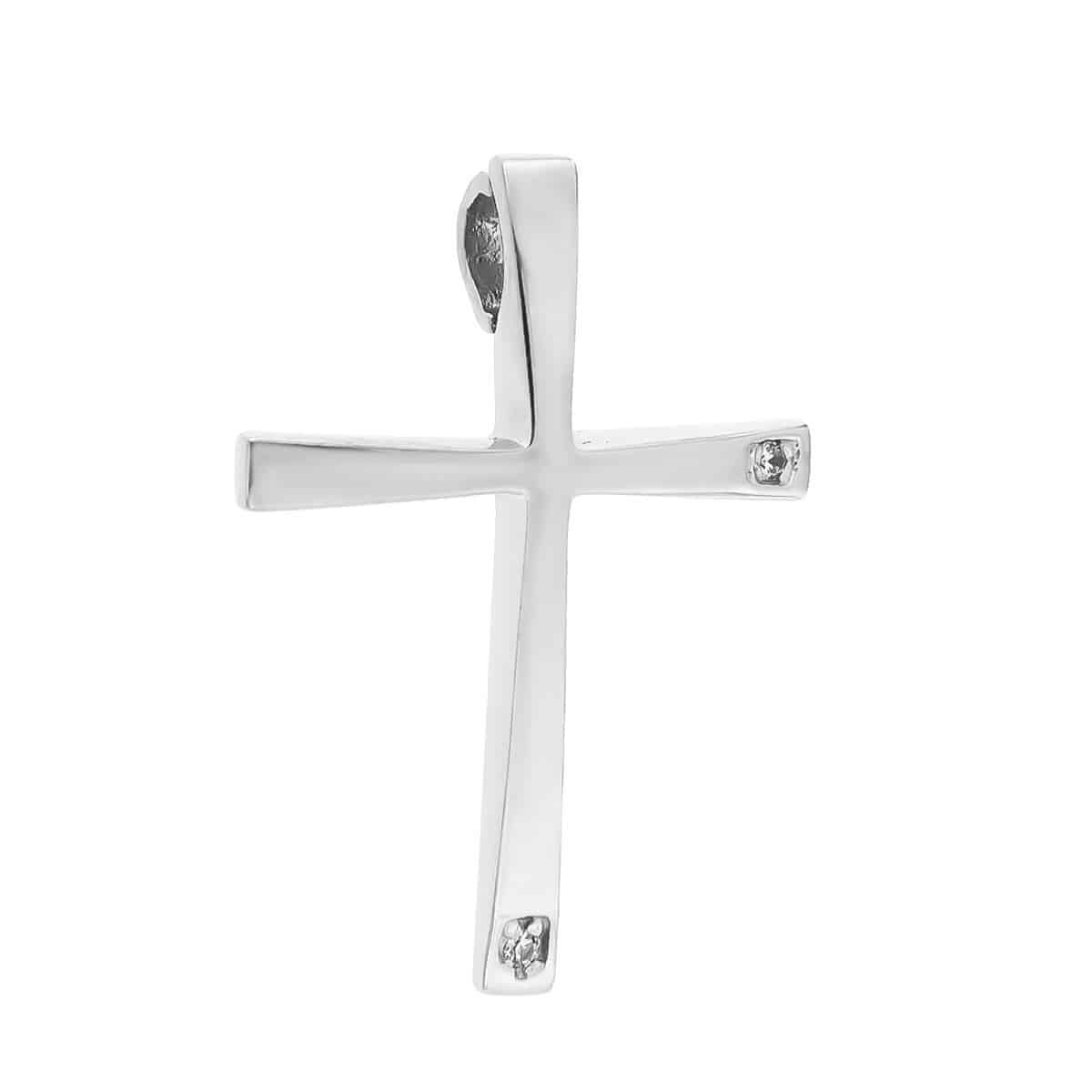 Λεπτός κυρτός λουστρέ σταυρός που στενεύει στο κέντρο με δύο λευκές ζιργκόν πέτρες να το στολίζουν σε δύο άκρες, σετ μαζί με την αλυσίδα του, από λευκό χρυσό 14 καρατίων.