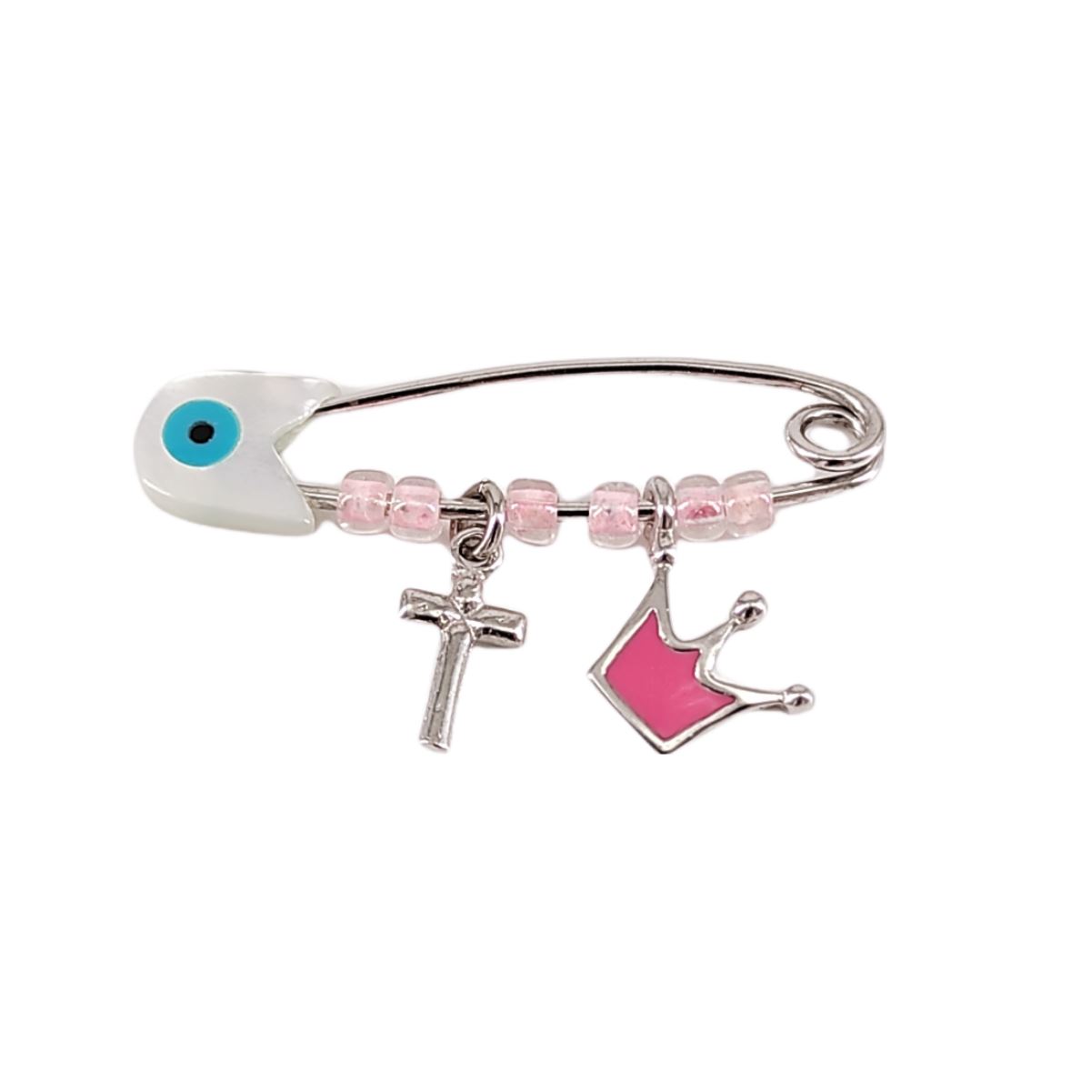 Παιδική παραμάνα με μάτι από mother of pearl στο κλείσιμο, χαντράκια κατά μήκος και κρεμαστά, σταυρουδάκι και κορώνα με ροζ σμάλτο, από λευκό επιπλατινωμένο ασήμι 925°. Πολύ όμορφο δώρο για το λίκνο ή το καροτσάκι του νεογέννητου κοριτσιού.