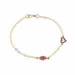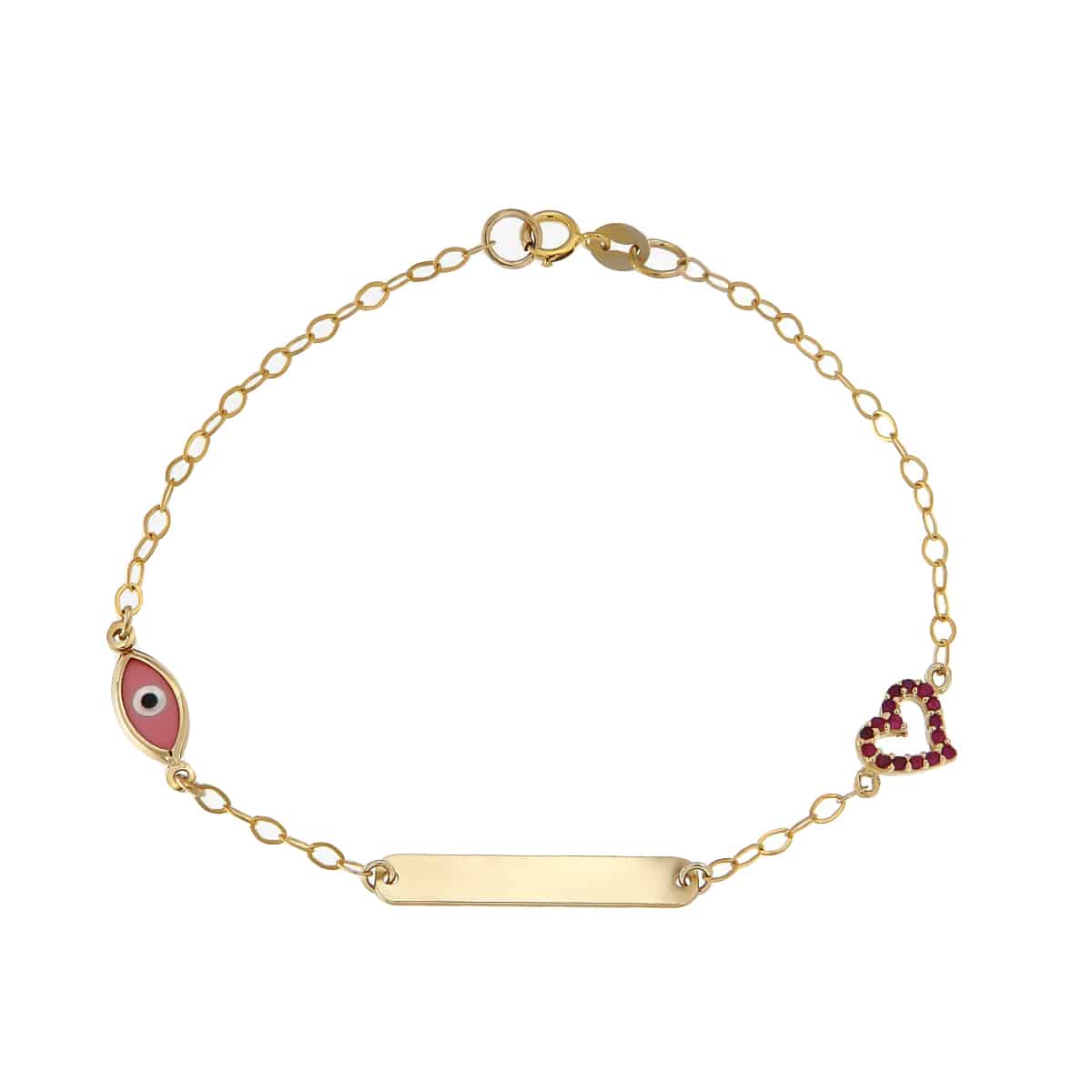 Όμορφη παιδική ταυτότητα – βραχιόλι για κοριτσάκια, ιδανική για χάραξη του ονόματος μετά τη βάπτιση ή την ονοματοδοσία, με αλυσίδα που από τη μία πλευρά της ταυτότητας έχει μάτι από ροζ mother of pearl και από την άλλη καρδούλα με κόκκινες πέτρες ζιργκόν, από κίτρινο χρυσό 9 καρατίων. Λόγω του σχεδίου της αλυσίδας μπορείτε να αυξομειώσετε το μήκος δεσίματος.