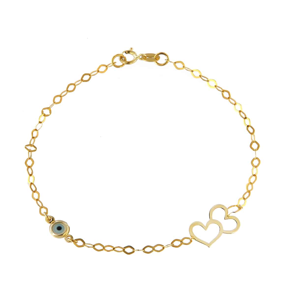Χαριτωμένο βραχιόλι για κοριτσάκια με αλυσίδα και ενσωματωμένο σχέδιο δύο καρδούλες και πιο πέρα στρογγυλό μάτι από λευκό mother of pearl σε πλαίσιο, από κίτρινο χρυσό 9 καρατίων. Υπέροχο δώρο για τη γέννηση, τη βάπτιση ή τη γιορτή, που μπορεί να έχει συναισθηματική αξία για το παιδί. Λόγω του σχεδίου της αλυσίδας μπορείτε να κλειδώνετε το κλιπ και πιο πριν ώστε να μειωθεί το μάκρος εάν χρειαστεί.
