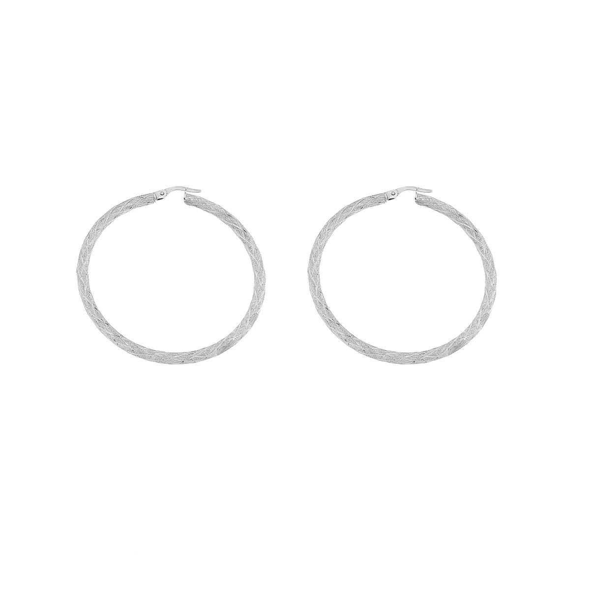 Ζευγάρι σκουλαρίκια κρίκοι με μεγάλο πάχος και πλεκτό ματ σχέδιο, από λευκό χρυσό 14 καρατίων. Για ιδιαίτερες εμφανίσεις.
